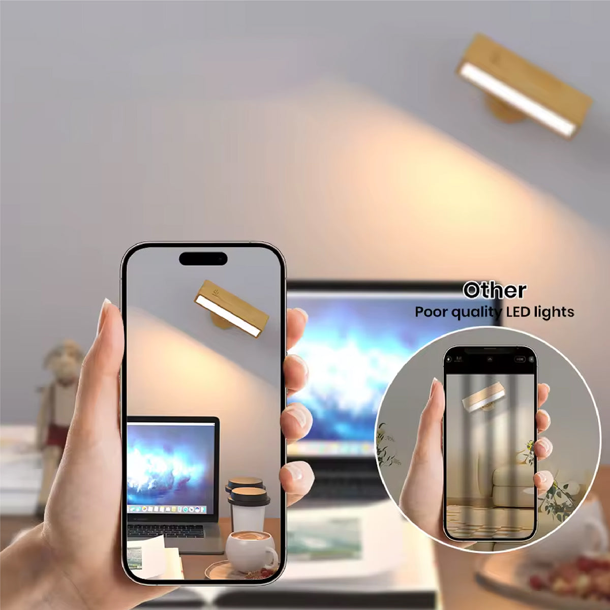 Die High Quality LED Lights der originalen Pinoc Wall Eye schonen deine Augen & Gesundheit im Vergleich zu herkömmlichen Leuchtmitteln vieler anderer LED-Leuchten! (Prüfe den Unterschied mit der Kamera deines Mobiltelefons, wie abgebildet). Fein ausgewähltes Massivholz, CNC-gefräst und liebevoll mit Handschliff vollendet, verleihen der Leuchte eine einzigartige Optik & Haptik. Perfektion vollendet!